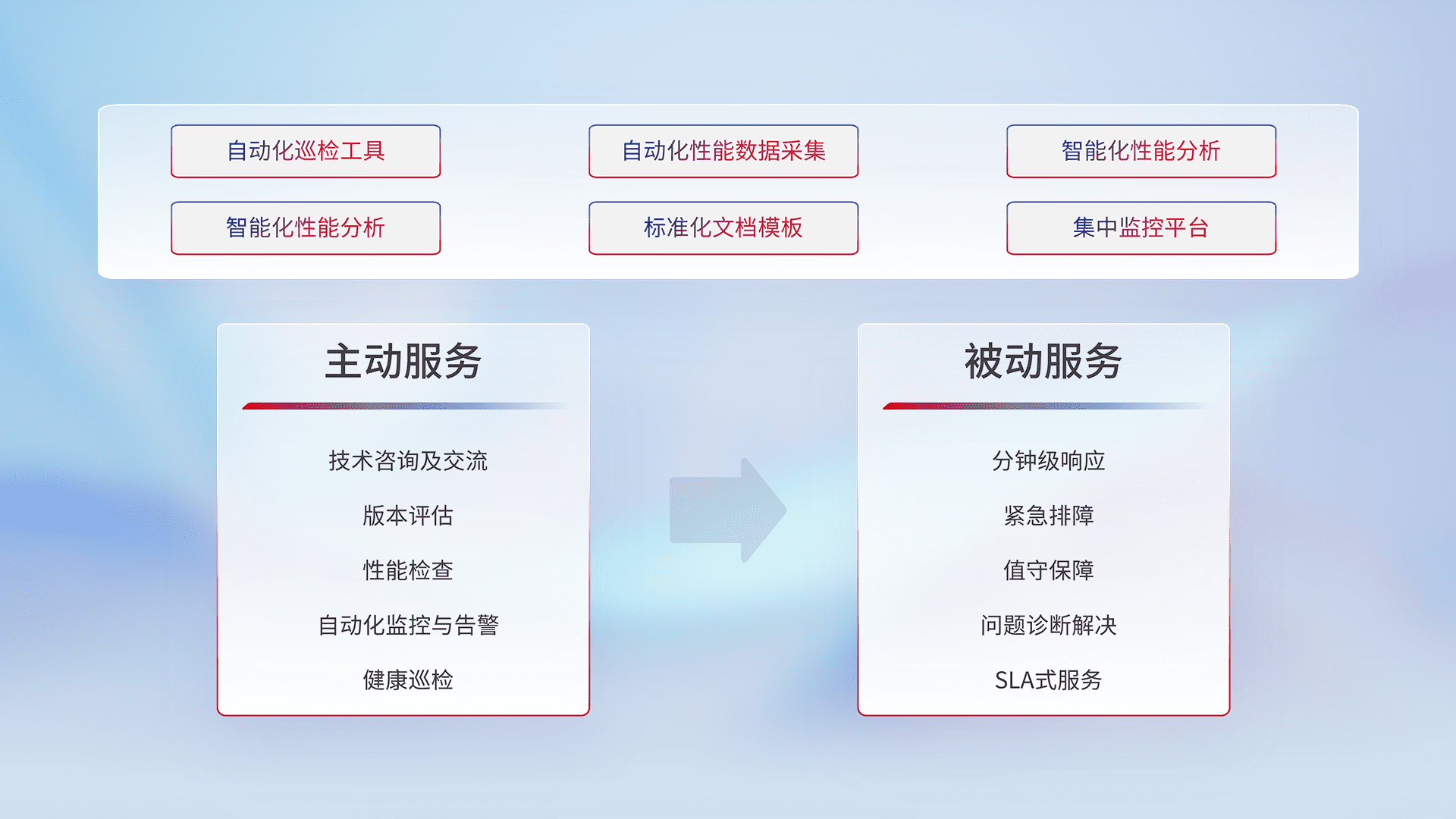 智能化工具和标准化文档,,,保障服务质量,,,提供主动服务(包含技术咨询、、、版本评估、、、性能检查、、自动化监控与告警、、、、健康巡检)和被动服务包含(分钟级响应、、紧急排障、、、、值守保障、、、、问题诊断解决、、SLA服务)。。。。